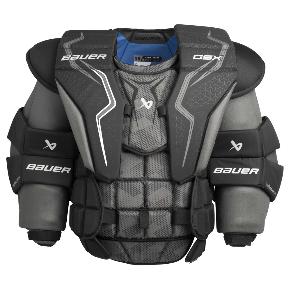 Le plastron Bauer GSX est conçu pour le gardien de but récréatif. Il permettra au gardien de but de se déplacer librement, tout en lui offrant la couverture et la protection nécessaires pour arrêter les rondelles. Parmi tous les plastrons récréatifs, c’est celui qui permet le plus d’ajustements, notamment au niveau du bras, du col et de l’estomac.